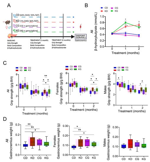 We then conducted linear regression models for grip strength adjusted by sex and age at the start of treatment and observed a significant effect of sex on grip strength performance (p < 0.001). To investigate whether a KD ± gemcitabine’s effect increases over time, we performed linear mixed-effects regressions. Both ketone bodies and grip strength determinations were fitted for repeatedly measured outcomes (measured at baseline, and 1 and 2 months after the start of the intervention), which included fixed effects for diet, drug, time, and their 2-way and 3-way interactions. As shown in Table 1, a significant diet-time interaction for grip strength was detected, indicating that the effect of a KD and a KD in combination with gemcitabine increases over time (1-Month KD vs. CD effect est. = −0.17 g/g BW, p = 0.12; 2-Month KD vs. CD effect est. = 0.45 g/g BW, p < 0.001). However, the estimated effect of gemcitabine was the same over time and across diet groups (est. = 0.07 g/g BW, p = 0.44).