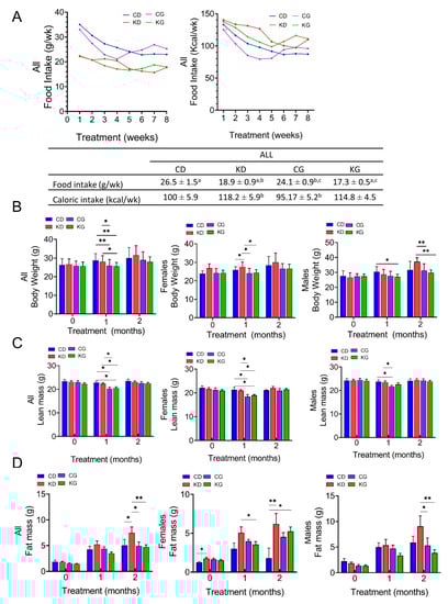 Although weekly mean intake in grams (g/wk) was significantly higher for CD (26.5 ± 1.5) and CG (24.1 ± 0.9) than for KD (18.9 ± 0.9) and KG (17.3 ± 0.5), the weekly caloric intake (Kcal/wk) was higher for KD (118.2 ± 5.9) and KG (114.8 ± 4.5) than for CD (100.5 ± 5.9) and CG (95.2 ± 5.2) (Figure 2A). Moreover, the caloric intake was significantly different for the CG group when compared to KD or KG (p < 0.05). When the data were disaggregated by sex, the feeding differences were observed in females but not in males (Figure S2).