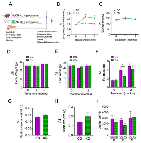 A ketogenic diet in combination with gemcitabine induces metabolic changes in KPC mice. (A) Schematic outline of the mechanistic study design. Female and male KPC mice were randomized to a control diet plus gemcitabine (CG) or to a ketogenic diet plus gemcitabine (KG) and euthanized after 2 months; n = 4 per sex/group. (B) Non-fasted blood β-hydroxybutyrate levels, (C) circulating levels of non-fasting glucose, (D) body weight, (E) lean mass, and (F) fat mass progression are shown at baseline, one and two months after diet plus gemcitabine initiation of KPC mice treated with CG or KG. (G) Gastrocnemius weight, (H) heart weight, and (I) serum leptin levels at euthanasia shown for CG- and KG-treated KPC mice. Values are expressed as mean ± SEM; * p < 0.05.