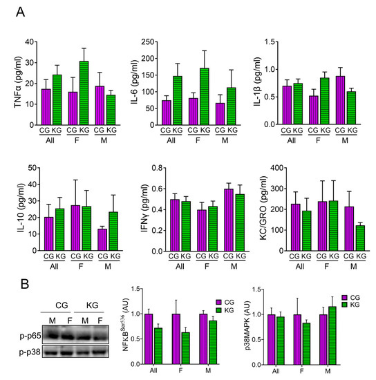 We assessed the levels of several cytokines involved in inflammation in serum of male and female KPC mice treated with KG or CG for two months. As shown in Figure 4, diet did not result in significant changes to circulating IL-6, TNF-α, IL-1β, IFN-γ, IL-10, KC/GRO, nor MCP-1 levels. Moreover, stratifying by sex had no effect on cytokine levels (Figure 4A). Even without changes in cytokine levels across diet, the phosphorylation of the inflammatory signaling molecule NFκB was lower in the KG mice (Figure 4B). When stratified by sex, the greatest effect was seen in the females. The phosphorylation of the inflammatory signaling protein p38MAPK was not different between the CG and KD groups.