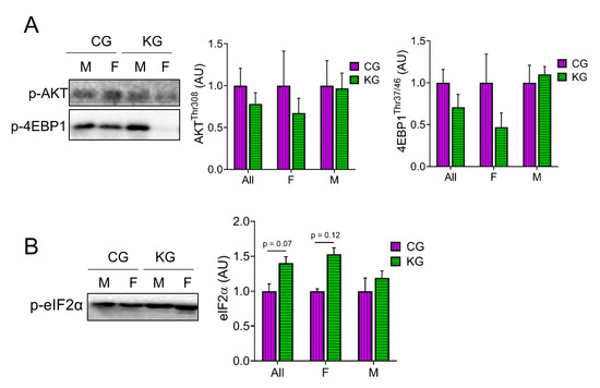 Effect of a ketogenic diet in combination with gemcitabine on skeletal muscle AKT and mTOR signaling. Immunoblots of (A) p-4EBP1, p-AKT, and (B) p-eIF2α proteins in gastrocnemius homogenates isolated from CG- and KG-treated female and male KPC mice following 2 months of treatment. n = 2–5 per sex/group; values are expressed as mean ± SEM.