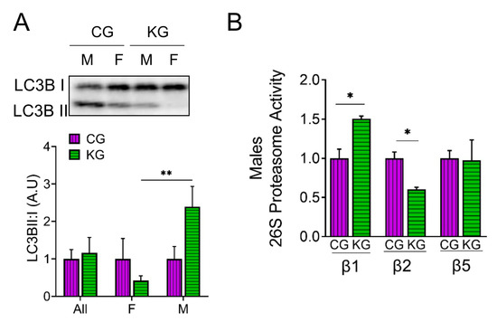 We next determined the effect of diet on the amount of LC3B-II and I to estimate autophagy and directly measured proteosome activity in the GTN of CG- and KG-treated KPC mice. An increase in the LC3B-II to LC3B-I ratio was observed in male KG-treated mice when compared to CG-males, whereas the ratio decreased in KG females, suggesting a sex-specific activation of autophagy in males and inhibition of autophagy in females on a KD (Figure 6A). We next evaluated the effect of KG on protein degradation through the ubiquitin–proteasome system (UPS), by measuring the activities of the 3 catalytic subunits of the constitutive proteasome: β1 (caspase-like), β2 (trypsin-like), and β5 (chymotrypsin-like) in male mice. In male mice, treatment with KG led to an increase in the activity of the β1 subunit and a decrease in β2 subunit activity when compared to CG group, whereas no differences in β5 activity were observed between the groups (Figure 6B). Consistent with the relatively minor changes in protein degradation observed, levels of the muscle-atrophy-related proteins MaFBx/atrogin-1 and muscle RING finger 1 (MuRF1) did not differ neither as a function of diet nor when stratified by sex (Figure S4).