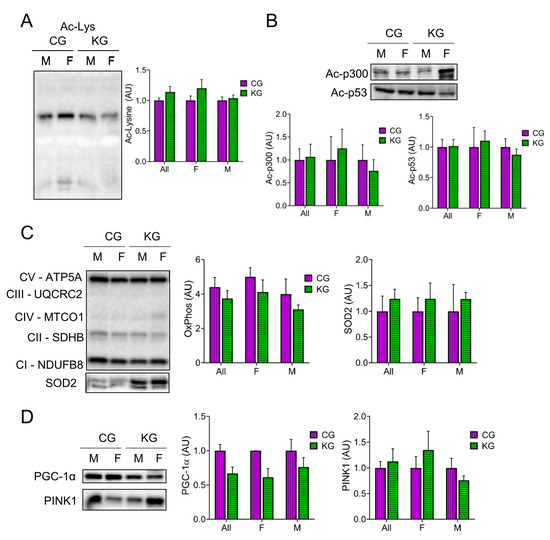 Since β-HB can inhibit histone deacetylases (HDACs) [27,28] and this can improve muscle function [24], we determined total acetyl-lysine levels in GTN muscles after two months on diet. Total acetyl-lysine levels were not different between the CG and KG groups (Figure 7A). A similar pattern was seen in the acetylation of the acetyltransferase p300 and the tumor suppressor protein p53, where the female mice tended to show higher levels than the males (Figure 7B). Since acetylation is important in the regulation of muscle metabolism, we next determined the effect of diet on mitochondrial mass and signaling. Surprisingly, there was no increase in the level of representative proteins within the electron transfer chain (oxidative phosphorylation; OXPHOS) after 2 months on a KD (Figure 7C), nor in the antioxidant enzyme superoxide dismutase levels (Figure 7C). Furthermore, the mitochondrial regulator PGC-1α tended to decrease in the KD groups (Figure 7D). The maintenance of mitochondria with a decrease in PGC-1α may reflect changes in mitochondrial turnover rates. To estimate the rate of mitophagy, we measured Pink1 levels in the GTN muscles. Pink1 levels were not different between the CG and KG groups (Figure 7D).