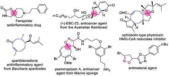 On the other hand, medium-sized rings (8–11 atoms) are rarely used for the construction of spirocyclic structures, reflecting the general tendency concerning medium rings. Although they possess appealing properties, such as a unique balance between rigidity and flexibility and diverse geometry, improve binding affinity to target enzymes, and are present in both bioactive and natural compounds (Figure 1) [12,13,14], application of medium rings in drug design is limited by the lack of synthetic approaches. Successful efforts to obtain the compounds containing medium rings, in most cases with heteroatoms, have been recently reported, illustrating the arising interest in such structures and the need for synthetic methods for them [15,16,17].