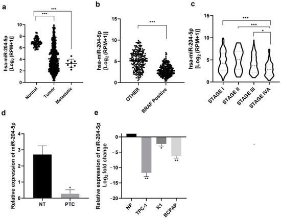 miR-204-5p is downregulated in human thyroid cancer and thyroid cancer-derived cell lines. (a–c) Analysis of miR-204-5p expression levels using thyroid miR-seq data from The Cancer Genome Atlas (TCGA), (a) in normal samples (n = 59), thyroid cancer tissues (n = 502) and metastatic samples (n = 8). *** p < 0.001 vs. normal; (b) in PTC tumors harboring the BRAFV600E mutation (BRAF Positive, n = 212) and those carrying other types of mutations (other, n = 248), *** p < 0.001; (c) in PTC tumors according to tumor stage, * p < 0.05. (d) Analysis of miR-204-5p expression levels by RT-qPCR in PTC and adjacent normal thyroid tissues (NT) (n = 7). * p < 0.05. (e) and in PTC-derived thyroid cancer cell lines including TPC-1, K1 and BCPAP (n = 3 for each cell line) compared to a pool of 8 normal human thyroid tissues (NP). * p < 0.05 and ** p < 0.01 and *** p < 0.001 vs. NP.