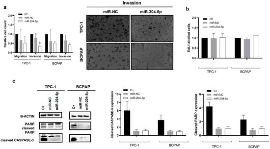 miR-204-5p overexpression inhibits invasion in PTC cell lines: (a) Cell migration and invasion were analyzed in TPC-1 (n = 6) and BCPAP (n = 3) cells three days after transfection, in non-transfected cells (NT), in miR-204-5p overexpressing (miR-204-5p) and mimicked negative control (miR-NC) transfected cells by counting five random fields. (a) Representative image after the invasion assay is shown in the right panel). * p < 0.05 vs. miR-NC. (b) EdU incorporation was analyzed in TPC-1 and BCPAP cells by flow cytometry three days after transfection in non-transfected cells (NT), and cells transfected with miR-204-5p mimic (miR-204-5p) or mimic negative control (miR-NC) cells (n = 3). (c) Cell apoptosis was analyzed by western blotting with cleaved CASPASE-3 and cleaved PARP antibodies and quantified by ImageJ in TPC-1 and BCPAP cells three days after transfection, in cells transfected with miR-204-5p mimic (miR-204-5p) or mimic negative control (miR-NC). TPC-1 and BCPAP cells treated with staurosporine for 20 h were used as a positive control (C+). Cleaved CASPASE-3 expression was normalized with β-ACTIN expression; for PARP, the proportion of cleaved PARP relative to total PARP (cleaved and non-cleaved) was determined.