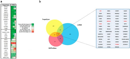 Gene expression analysis reveals a lot of EMT genes whose expression is dysregulated following miR-204-5p expression. (a) Heatmap of the microarray results showing the genes differentially expressed between TPC-1 cells overexpressing miR-204-5p or mimic negative control (miR-NC) and which were validated by luciferase reporter assay as being miR-204-5p targets. Fold change for each gene was defined using gene expression ratios between miR-204-5p and miR-NC transfected cells. The colors of each probe represent the amplitude of the fold changes, as shown in the legend. (b) Venn diagram of predicted and validated targets of miR-204-5p from three online databases. Genes common between the intersection of the three databases and the microarray results and known to be involved in cell adhesion or invasion are shown in red.