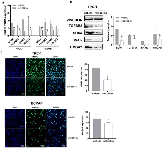 To validate potential target genes of miR-204-5p involved in EMT and derived from the above analyses, we investigated by RT-qPCR, western blot or immunocytofluorescence whether their expression was modified in miR-204-5p transfected TPC1 and BCPAP cells: SOX4, TGFBR2, SNAI2 and HMGA2 mRNA and protein levels were decreased (Figure 4a,b). HMGA2 protein level was also significantly decreased in miR-204-5p overexpressing TPC-1 and BCPAP cells as measured by immunocytofluorescence (Figure 4c). Most results obtained by our RT-qPCR analyses validated the Affymetrix data except for HMGA2, which could be explained by cross-hybridization problems, a sub-optimal design of probes or an incorrect probe annotation []. Indeed, HMGA2 had previously been validated by RT-qPCR and western blot as a target of miR-204-5p in the lab, and our results thus confirmed the previous ones. These data support the role of miR-204-5p in EMT by its regulation of different EMT key players.