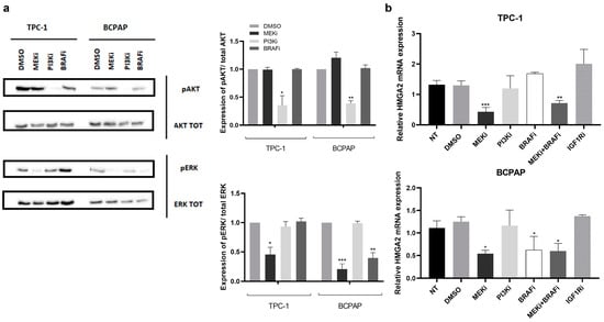 Trametinib and GDC0941 treatments were associated respectively with suppression of the RAF/RAS/MEK/ERK and PI3K/AKT signalling pathway with the almost complete loss of ERK and AKT phosphorylation in TPC-1 and BCPAP cells, as shown in Figure 5a. As expected, [,], the dabrafenib treatment led to an inhibition of ERK phosphorylation only in BCPAP cells that are BRAFV600E positive, while it was inefficient in TPC-1 cells that are BRAF WT.