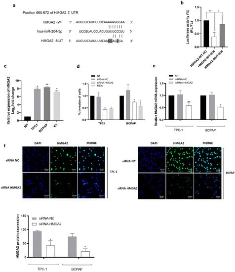 Since the majority of PTC are driven by oncoproteins that activate the MAPK signalling pathway, we hypothesized that miR-204-5p could inhibit invasion of thyroid cancer cells by targeting effectors of this pathway and, more specifically, by targeting directly HMGA2, a critical regulator in cancer development that plays a pivotal role in EMT. To confirm that HMGA2 is a direct target of miR-204-5p, a luciferase reporter assay was performed: the 3′UTR of HMGA2 containing the putative miR-204-5p binding region fused to a constitutively expressed luciferase reporter was transfected into TPC1 cells. The sequence of the predicted binding site of miR-204-5p on the 3′UTR HMGA2 sequence and the corresponding mutated sequence is shown in Figure 6a. Results indicated that the luciferase activity of TPC-1 cells containing the wild type 3′UTR of HMGA2 co-transfected with mimic miR-204-5p (HMGA2-WT-204) was dramatically decreased compared to the cells transfected with a negative control mimic (HMGA2-WT-NC) (Figure 6b). No significant effect on the luciferase activity of TPC-1 cells containing the corresponding mutated sequence (HMGA2-MUT-204) following co-transfection with mimic-204-5p was detected, demonstrating that miR-204-5p can specifically directly bind to the 3′UTR of HMGA2.