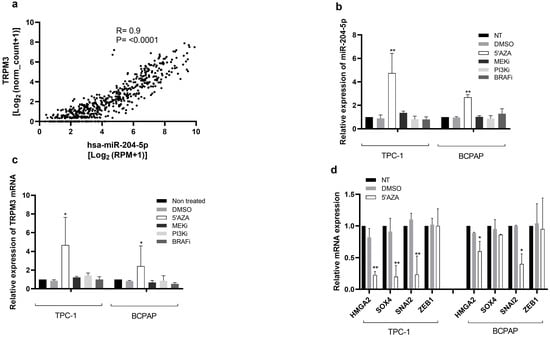 Inhibiting DNA methylation increases miR-204-5p and TRPM3 mRNA expression. (a) Correlation analysis between TRPM3 mRNA and miR-204-5p expression levels in the thyroid cancer samples from The Cancer Genome Atlas (TCGA). R = Pearson correlation. (b,c) Expression levels of miR-204-5p (b) and TRPM3 (c) were analyzed in TPC-1 and BCPAP cells by RT-qPCR after treatment with DMSO, 5′-aza-2-deoxycytidine (5′AZA), trametinib (MEKi), GDC0941 (PI3Ki) or dabrafenib (BRAFi) for 24 h and compared to non-treated cells (NT) (n = 5). * p < 0.05 and ** p < 0.01 vs. DMSO. (d) RT-qPCR analysis of mRNA expression of miR-204-5p targets (HMGA2, SOX4, SNAI2) in non-treated (NT) TPC-1 (n = 5) and BCPAP cells (n = 3) and after treatment with 5′-aza-2-deoxycytidine (5′AZA) or DMSO for 24 h. ZEB1 mRNA expression was not a miR-204-5p target and was used as a negative control. * p < 0.05 and ** p < 0.01 vs. DMSO.