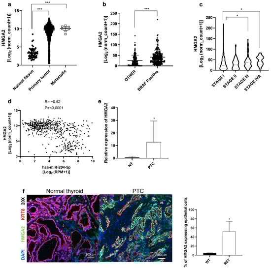 HMGA2 is overexpressed in human papillary thyroid cancer. (a–d): Analysis of HMGA2 mRNA expression using thyroid RNAseq data from The Cancer Genome Atlas (TCGA) (a) in normal tissues (n = 57), primary tumors (n = 502) and metastatic samples (n = 8), *** p < 0.001 vs. normal tissue; (b) in primary tumors harboring the BRAFV600E mutation (BRAF Positive, n = 216) and those with other mutations (other, n = 211), *** p < 0.001 and (c) according to tumor stage. * p < 0.05. (d) Correlation analysis between HMGA2 mRNA and miR-204-5p expression in the thyroid cancer samples from The Cancer Genome Atlas (TCGA). R = Pearson correlation. (e) HMGA2 mRNA expression analyzed by RT-qPCR in 7 independent PTCs and normal adjacent tissues (NT). * p < 0.05 vs. NT. (f) Immunostaining of HMGA2 (green) in PTC and normal thyroid (n = 3). Epithelial cells were stained with cytokeratin 8 antibody (KRT8, red) and nuclei with DAPI (blue). The % of HMGA2 expressing epithelial cells was evaluated by the ratio: several cells positive for both HMGA2 and KRT8/number of KRT8 positive cells ×100.
