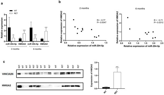 miR-204-5p is downregulated while HMGA2 is overexpressed in the thyroid of RET/PTC3 mice. (a) RT-qPCR analysis of miR-204-5p and HMGA2 mRNA expression in 2- and 6-month-old RET/PTC3 (RET) mice thyroids (n = 11 for two months and n = 9 for six months) and a pool of 3 normal thyroids (WT) (n = 6). ** p < 0.01 and *** p < 0.001 vs. WT. (b) Correlation analysis between HMGA2 mRNA and miR-204-5p expression in 2- and 6-months old RET/PTC3 thyroids. R = Pearson correlation. (c) Western blot analysis and quantification of HMGA2 protein expression in 2-month-old wild type (WT) and RET/PTC3 (RET) thyroids (n = 5 for WT and n = 9 for RET). *** p < 0.001 vs. wild-type thyroids. (d) Analysis of HMGA2 expression by immunostaining with HMGA2 antibody (green) and cytokeratin eight antibody (KRT8, red) and DAPI (blue, nuclei staining) in 2- and 6-month-old thyroids (n = 7). The % of HMGA2 expressing cells among the epithelial cells was defined by the ratio: several cells positive for both HMGA2 and KRT8/number of KRT8 positive cells ×100.