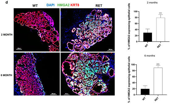 Cancer cell lines are only partial models of the in vivo corresponding tumors []. To investigate the in vivo relevance of the relationship between miR-204-5p and HMGA2 expression and their role in thyroid tumorigenesis, the use of mouse models of human cancers is very helpful. We used the RET/PTC3 transgenic mice model []. These mice express in their thyroid, under the control of the thyroid-specific thyroglobulin promoter, the human RET/PTC3 rearrangement, encoding a fusion protein between the RET tyrosine kinase domain and the 5′ terminal region of the ELE1 gene. This results in an abnormal expression of the RET/PTC3 oncoprotein triggering the constitutive activation of the MAPK and PI3K signalling pathways. These mice develop solid type papillary thyroid carcinoma and represent a suitable model of husolid-type9,30]. As shown in Figure 9a, miR-204-5p expression levels were strongly reduced while HMGA2 mRNA expression was enhanced in 2- and 6-month-old RET/PTC3 thyroids (RET) compared to wild type (WT) thyroids. A correlation analysis from our RT-qPCR data indicated a significant inverse correlation between the expressions of miR-204-5p and HMGA2 mRNA in 2- and 6-months old RET/PTC3 thyroids (R = −0.77, p = 0.0047; R = −0.71, p = 0.0312 respectively) (Figure 9b). HMGA2 protein expression was also increased in RET/PTC3 compared to WT thyroids, measured by western blotting (Figure 9c) as well as by immunocytofluorescence (Figure 9d). HMGA2 staining was detected in the thyroid epithelial cancer cells (KRT8 positive), with 80–90% of these cells expressing the protein. Our previous observations in human PTC are closely thus recapitulated in a mouse model of PTC and opens new research perspectives to delineate the role of miR-204-5p and HMGA2 in thyroid tumor development.