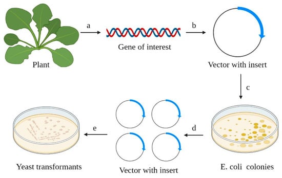 The key steps in the expression of heterologous protein in yeast cells. (a) The gene of interest (cDNA) is isolated from a plant sample; (b) the cDNA (blue arrow) is integrated into the host vector; (c,d) E. coli is routinely used for construct amplification; (e) yeast cells are transformed by the vector containing the cDNA of gene of interest. Selection of colonies (E. coli, yeast colonies) is carried out on selective media.