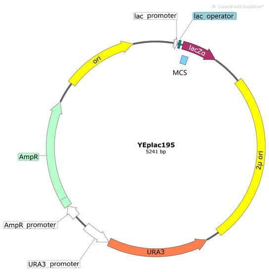 Figure 1 shows the scheme of an experiment on cloning the gene of interest from plants in yeast cells. All types of plasmids used for the design of constructions of heterologous expression in yeast cells are binary (or shuttle) vectors [12,23]. They contain the sequences derived from bacterial plasmids and the components of a yeast replication system, permitting them to replicate in both E. coli cells and yeast cells. The ability to replicate in E. coli cells ensures the simplicity of manipulations and the convenience to obtain large amounts of plasmids.