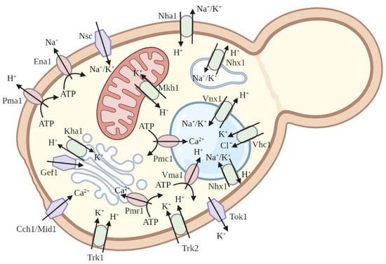 Other yeast cell compartments also have several ion transport proteins with selectivity for potassium and sodium. For example, the cation/H+ antiporter Nhx1 with high affinity to Na+ and K+ is located in the tonoplast and endosomal membranes; K+/H+- antiporter Kha1 functions in the Golgi apparatus; protein Mkh1, which exchanges H+ for K+, was detected in mitochondria [45].