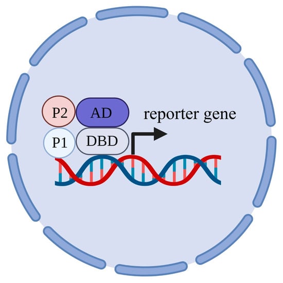 Scheme of classic yeast two-hybrid technique. DBD—DNA-binding domain; AD—activation domain; P1—“bait” (protein of interest, POI); P2—“prey”.