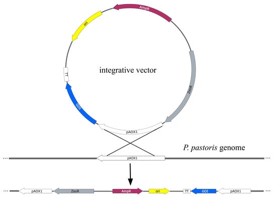 For P. pastoris, the vector constructs to express heterologous proteins are usually based on integrative vectors. After the transformation of P. pastoris cells, the construction integrates into the genome, providing clones that carry the target sequences [12]. This integration is ensured by the mechanism of homologous recombination and is realised at specific genomic loci (Figure 6). Typically for P. pastoris, it is the region of the promoter pAOX1; locus pGAP is also used (see later) [11]. The integration of the gene of interest into the yeast chromosome guarantees the stability of the resultant strains. Unfortunately, it is not possible to control the number of vector copies that integrate into the genome, so the optimal transformed clone has to be determined experimentally. A simple method is the screening of colonies in the presence of rising concentrations of the antibiotic zeocin [153]. Real-time PCR can be used to estimate the number of vector copies integrated into the genome [154].