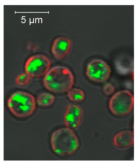 Gene (cDNA) of P-type ATPase from the marine microalga Dunaliella maritima similar to higher plant H+-ATPases (DmHA2; GenBank ID: KX 832225.1) fused with GFP coding sequence is expressed (green colour) in transformed P. pastoris cells (the GS115 strain). The plasma membranes of the yeast cells are stained with a fluorescent lipophilic dye FM 4-64 (molecular probes) (red colour).