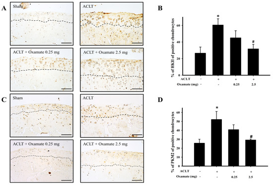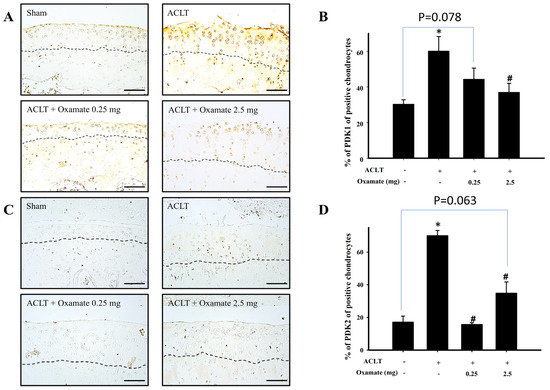 Effect of oxamate on pyruvate dehydrogenase kinase 1 and pyruvate dehydrogenase kinase 2 expression in cartilage tissues after ACLT administration. Immunohistochemical analysis of (A) pyruvate dehydrogenase kinase 1 and (C) pyruvate dehydrogenase kinase 2 in joint sections from the sham, ACLT, and ACLT + oxamate (0.25 or 2.5 mg/kg) groups. The quantitative analysis of the ratio of (B) pyruvate dehydrogenase kinase 1-positive and (D) pyruvate dehydrogenase kinase 2-positive cells in joint sections is presented. Data are expressed as means ± SEM for each group. The scale bar represents 100 μm. (* p < 0.05, compared with the sham group; # p < 0.05, compared with the ACLT group). PDK: pyruvate dehydrogenase kinase.