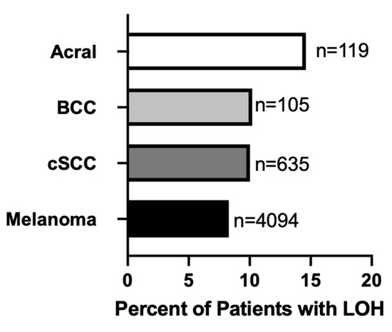 Prevalence of genome-wide LOH-High (≥16% of segments analyzed) among cutaneous cancer (acral, basal cell carcinoma (BCC), cutaneous squamous cell carcinoma (cSCC) and melanoma) patient samples profiled at Caris Life Sciences (n = 4953).