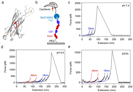Mechanical unfolding of ParV by using AFM-based single-molecule force spectroscopy experiments. (a) Structure of the ParV protein, ester bond is shown in red; calcium ions are shown as orange spheres; (b) schematic of the AFM-based SMFS experiments. Fgβ-(GB1-ParV)2-cys was covalently linked to the substrate through a polymer linker via thiol-maleimide chemistry and picked up by a SdrG-cys-modified cantilever; (c) representative single-molecule force-extension curves with a pulling speed of 1.6 μm s−1 at pH 7.4 showing the unfolding of GB1 domains but no unfolding events of ParV up to the dissociation of the Fgβ-SdrG complex (>2 nN). The curves are fitted by the worm-like chain model; (d,e) representative force-extension curves at pH 9.0 and with 10 mM EDTA, respectively. Except for the two GB1 unfolding events, there are two additional peaks with ΔLc 46 nm corresponding to the unfolding of ParV.
