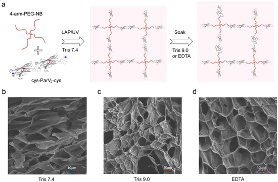 Responsive covalent hydrogel formed by polyprotein cys-ParV2-cys with 4-arm-PEG-NB. (a) Schematic illustration of the preparation of the covalent hydrogel. The hydrogel is prepared by the photoclick reaction of polyprotein and PEG using UV illumination and LAP as initiators in Tris buffer at pH 7.4. After sufficient swelling, the hydrogels were soaked in different conditions: Tris buffer at pH 7.4, Tris buffer at pH 9.0, and Tris buffer at pH 7.4 with 10 mM EDTA; (b–d) SEM images of the lyophilized hydrogels.