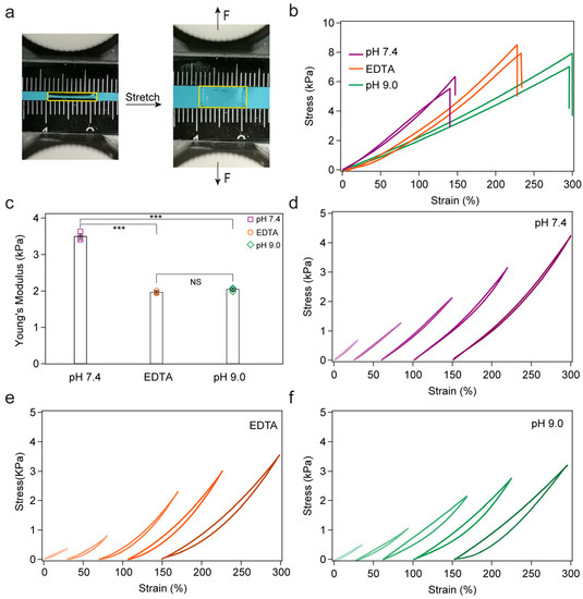 The bulk mechanical properties of the hydrogels. (a) Tensile test experiments. The yellow rectangles indicate the hydrogel; (b) stress–strain curves for hydrogels under different conditions; (c) Young’s modulus of hydrogels in all three conditions; the numbers of hydrogels in all conditions are 3. (d–f) Representative stretching-relaxation curves at different strains for hydrogels. The curves are horizontally offset for clarity. *** indicates p < 0.05.