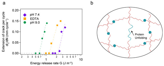(a) Extension of crack per cycle as a function of the energy release rate; (b) schematic of the protein hydrogel network sample in pH 9.0 or with EDTA, having a topological defect induced by the unfolding of protein.