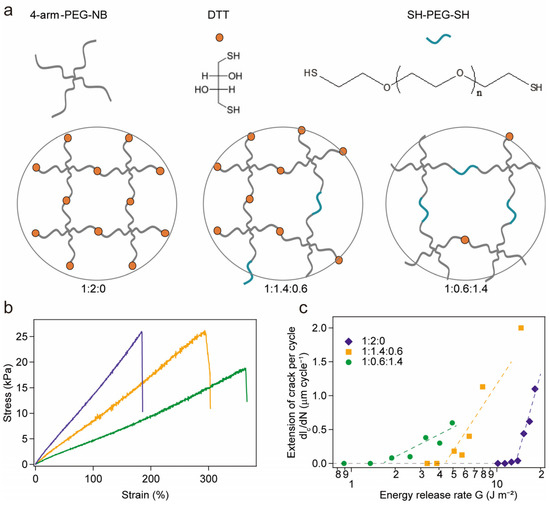 (a) Schematic illustrations of the synthesis and structures of hydrogels with different ratios in 4-arm-PEG-NB, DTT and SH-PEG-SH through the thiol-norbornene photoclick chemistry; (b) stress–strain curves of the hydrogels in different ratios; and (c) extension of crack per cycle as a function of the energy release rate.