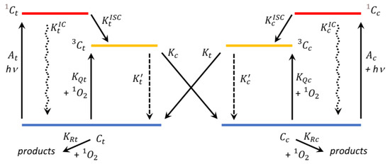 is the initial concentration of the solution. The 1, 3 superscript numbers of concentrations mean singlet- and triplet-excited states; the dot apices indicate the time derivatives of populations; and the light excitation of ground-state molecules to the singlet excited states is driven by the rate constants.
