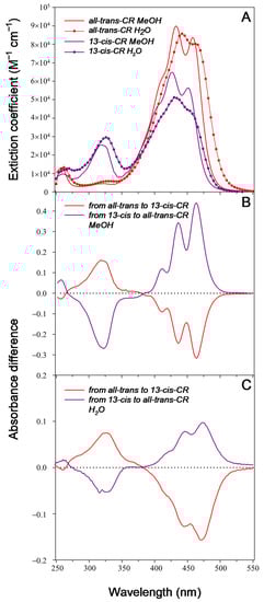 Interestingly, results in term of isomerization quantum yields and isomer photoequilibrium concentrations obtained in both water and methanolic solutions were rather similar, and closely recall that described for β-carotene in non-polar solvents [