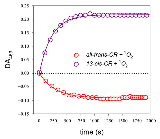 The time evolution of the CR-1O2 reaction was monitored following the temporal changes of the absorbance at 463 nm, the maximum of the isomerization difference absorption spectrum. The bleaching of crocin was simultaneously checked by measuring absorbance at 380 nm, isosbestic point between the two crocin isomers. The overlapping of the Naph absorbance with that of the cis/trans-CR mixture in the ultraviolet region below 340 nm made it impossible to follow the evolution of the “cis peak” at 321 nm.