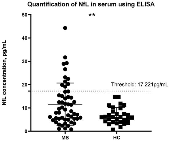 Quantification of NfL concentration in the serum of MS patients and HCs using ELISA. The threshold has been set as 3 S.D. above the mean of the HCs, indicated by the dashed line. NfL concentration above the threshold is associated with an increased risk in clinical activity. Welch’s t-test was applied for the statistical analysis, significant difference was found between the two groups (** p < 0.008). MS: Multiple Sclerosis; HC: Healthy Controls.