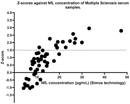 Z-scores were calculated using the internet-based application created by the Jens Kuhle group (https://shiny.dkfbasel.ch/baselnflreference (accessed on 30 June 2022)), where the NfL concentration from the Simoa method together with the participant’s BMI and age are taken into consideration. A z-score more or equal to 1.5 is considered abnormal and is indicated by the dashed line. Sixteen MS patients had a z-score above 1.5. MS: Multiple Sclerosis; BMI = Body Mass Index.
