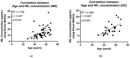 Pearson correlation has been applied to illustrate the relationship between age and NfL concentration using the Simoa method. (a) A moderate positive correlation (r = 0.447) has been found between age and NfL concentration of the MS patients. (b) A moderate positive correlation (r = 0.607) has been found between age and NfL concentration of the HC participants. MS: Multiple Sclerosis; HC: Healthy Controls.
