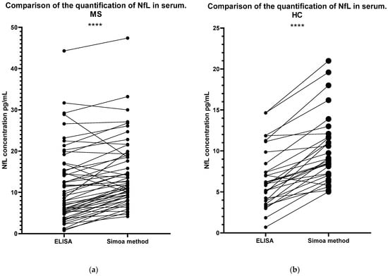 Comparison of the Simoa method and ELISA for the quantification of NfL concentration in the serum of MS patients (a) and HCs (b). For a clear comparison, a line has linked the same serum samples. A strong positive correlation has been found in the ranking of the samples in the two techniques (r = 0.8691), utilizing Spearman’s rank correlation. Paired t-test was used to analyse the significant difference in the NfL concentrations quantified using the two methodologies. Significant difference was found for both the MS group and for the HC group (**** p < 0.0001). MS: Multiple Sclerosis; HC: Healthy Controls.