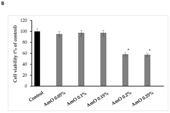 Due to its unique chemical composition, AmO exhibits cytoprotective and antioxidant potential, suggesting its promising application as a UV-radiation-protective substance for skin care purposes []. We found that the effect of AmO on cell viability varied depending on the concentration used. The application of low concentrations (0.05%, 0.1% and 0.15%) of the oil had no significant effect on the viability of human skin fibroblasts. In contrast, the use of higher concentrations (0.2% and 0.25%) of this oil resulted in a decrease in cell viability to about 58% and 57% of the control value, respectively. Studies by Semen et al. [] provided evidence that amaranth oil exhibits both antioxidant and pro-oxidant effects in human lung fibroblasts. At low concentrations of the oil, fibroblasts were protected from oxidative stress, while incubation with high concentrations of the oil resulted in an increase in intracellular ROS generation and cell damage. The observed decrease in cell viability at high concentrations of AmO was attributed to the physical effect of the oil itself on the cells, which led to their exclusion from further experiments (Figure 1B).