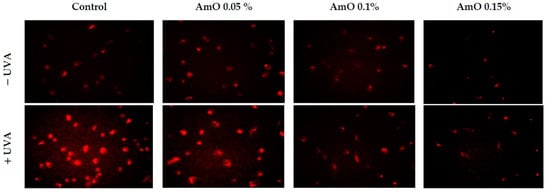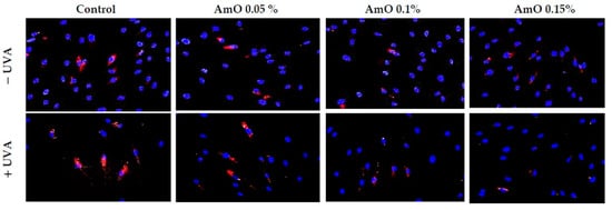 The ROS lead to the formation of oxidation-dependent DNA damage, such as single-strand breaks. UVA-induced DNA damage also leads to the mutations of proto-oncogenes and tumor suppressor genes, such as the previously described p53 []. AmO evoked a protective effect on the process of DNA biosynthesis in UVA-treated fibroblasts. In the UVA-treated cells, DNA biosynthesis was decreased by 45% compared with the control cells. In the presence of AmO at 0.05%, 0.10% and 0.15% concentrations, DNA biosynthesis was increased by 12%, 29% and 31%, respectively, despite the toxic effect of UVA and this was statistically significant (p < 0.05) (Figure 11, Table 2). Based on the obtained results, it can be assumed that the application of AmO protected cellular DNA from the damaging effects of UVA radiation.
