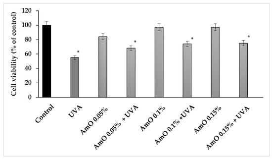 Cell viability in fibroblasts irradiated with UVA and treated with AmO at concentrations of 0.05%, 0.1% and 0.15% vs. the control. The mean ± standard error (SEM) values from the experiments performed in triplicates. * Statistically significant differences at p < 0.05 compared with the control.
