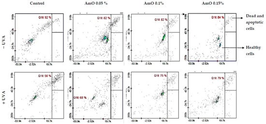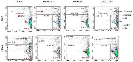Cytometric assay of apoptosis in UVA-irradiated fibroblasts treated with AmO at concentrations of 0.05%, 0.1% and 0.15% vs. the control. The cells were stained with fluorescent dyes using Propidium Iodide and Annexin V.