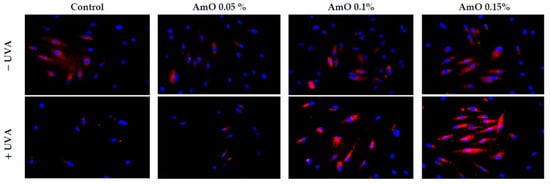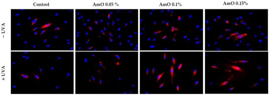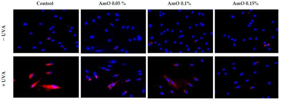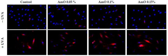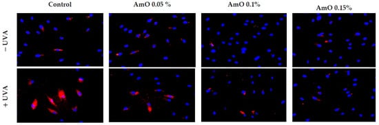 Fluorescence analysis of ROS generation in UVA irradiated fibroblasts treated with AmO at concentrations of 0.05%, 0.1% and 0.15% vs. the control. Red fluorescence intensity represents the amount of generated ROS. The images were obtained at a 20× magnification.