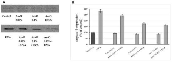 Studies by Bernard et al. [] indicated that in contrast to UVB, UVA radiation at doses consistent with realistic sun exposure induces oxidative stress in cells. UVA produces singlet oxygen, which depolarizes mitochondrial membranes, induces oxidative damage to DNA and initiates late apoptosis. In contrast, UVB causes only late apoptosis. Interestingly, exposure to UVA in vivo did not induce apoptosis in epidermal cells. These results were confirmed in reconstructed UVA-treated skin, in which apoptosis was observed in fibroblasts of the dermis but not in epidermal keratinocytes []. Our study indicated that UVA radiation at a dose of 10 J/cm2 significantly reduced the survival rate and induced apoptosis in the fibroblasts. The application of AmO at concentrations of 0.1% and 0.15% significantly reduced these processes (Figure 5). We also demonstrated that the used dose of UVA radiation induced the mitochondrial apoptosis pathway, which was accompanied by a significant increase in the expression of the apoptosis-inducing factor p53 protein (Figure 6), as well as caspase-9 (Figure 7) and caspase-3 (Figure 8), which play a key role in this process. Treatment of the cells with selected concentrations of AmO caused decreases in the expressions of these proteins, which are the markers of apoptosis. This suggests that UVA-dependent activation of apoptosis through the intrinsic pathway is inhibited by AmO in fibroblasts.