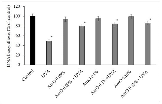 DNA biosynthesis in the UVA irradiated fibroblasts in the presence of AmO at concentrations 0.05%, 0.1% and 0.15% vs. the control. The mean ± standard error (SEM) values from the experiments performed in triplicates. * Statistically significant differences at p < 0.05 compared with the control.