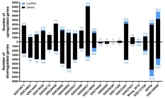 The number of deregulated genes in each selected study for the “Subtype” analysis. The bar graph shows the absolute frequency of upregulated (upper part) and downregulated (lower part) genes, depicting the fraction corresponding to lncRNA genes in blue at the ends of the bars.