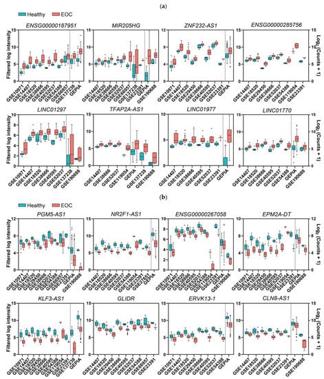 Expression levels in EOC and normal ovary tissues of the top deregulated lncRNAs that were discovered in the EOC meta-analysis. (a,b) Panels correspond to upregulated and downregulated genes, respectively. The middle line in each boxplot represents the median value, and the black dots are the outlier values. Comparisons from the dotted line to the left are from microarray studies, and comparisons from the dotted line to the right are from RNA-Seq studies, except for GLIDR and ENSG00000285756, for which all comparisons are from microarrays. ZNF232-AS1, ATP2A1-AS1, LINC01977, TFAP2A-AS1, and NR2F1-AS1 are not represented in this figure, because only fold changes and p-values are available in this study [20]. All comparisons are p ≤ 0.01.