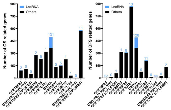 The numbers of genes affecting OS (left) and DFS (right) in each selected study for the “Prognostic” analysis. The bar graph shows the absolute frequency of genes; the portion in blue at the ends of the bars is the fraction corresponding to lncRNA genes. NA (not applicable) means that there is no patient information about DFS for those studies, whereas 0 means that there are no statistically significant genes.