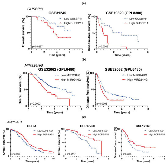 Kaplan–Meier curves for three lncRNAs affecting survival periods in EOC patients: (a) GUSBP11, (b), MIR924HG, (c), and AQP5-AS1. Graph titles indicate each corresponding study.