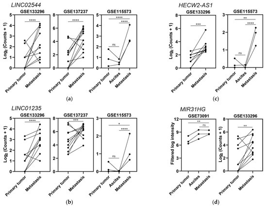 Expression levels of four lncRNAs upregulated in metastases: (a) LINC02544, (b) LINC01235, (c) HECW2-AS1, and (d) MIR31HG. Dots represent tissue samples, and lines join the samples from each patient; * p ≤ 0.05, ** p ≤ 0.01, *** p ≤ 0.001, **** p ≤ 0.0001, ns p > 0.05.